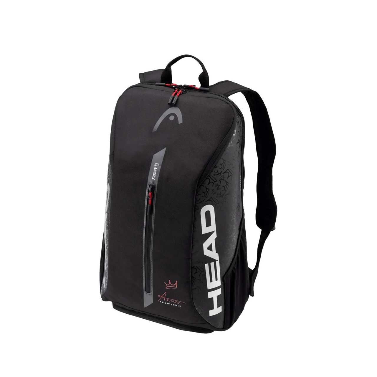 Ryggsäcken är en del av Arturo Coello-kollektionen och har designats och utvecklats i samarbete med “King Coello”. Hans karakteristiska kronlogga pryder sidan med en glansig finish som förstärker det eleganta uttrycket. Den silverfärgade HEAD-logotypen skapar en stilig kontrast mot det svarta materialet, medan den röda insidan – en av Coellos favoritfärger – ger väskan en personlig touch. Kronlogotyperna på axelremmarna bidrar ytterligare till ryggsäckens distinkta premiumkänsla som Coellos fans kommer att uppskatta.